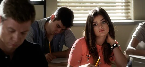 In fact, Aria is so upset that she can’t complete her math test. So she copies from Andrew Campbell’s test as he conveniently holds his paper up for her to see. Now Andrew is the class Valedictorian, so I know he knows better. This all seems like a set up to me. Andrew later confronts Aria about cheating and suggests that he can be her tutor.