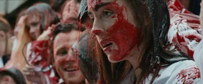 But just as vivid are the parallels between human and animal. The veterinary-school setting is filled with unsettling interactions between the two, such as an early scene where a group of freshman help tranquilize and transport a horse. This interaction is a normal part of vet work, but the tremendous size of the equine is an uncanny glimpse into the evolutionary power human minds wield over physically superior animals. When Juliet accidentally scissors off Alexia’s finger-tip as part of a botched Brazilian waxing (you read that correctly), their pet German Shepard comes into frame in search of a treat. We’re expecting the dog to find the severed digit, but Raw is not a movie about unsavory animal behaviors. And there is a strong argument that the film reflects the audience’s appetite for gore as much as the character’s appetite. Justine chews at the finger like a buffalo wing, in a perfect parallel to an earlier scene depicting a late-night shawarma feast. It serves the viewer more than the character. Audiences should know what they are getting into.